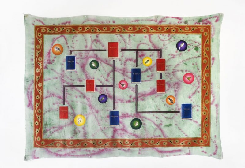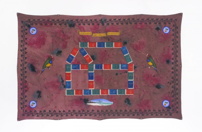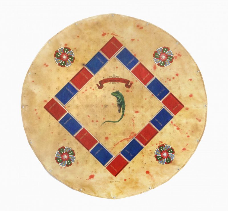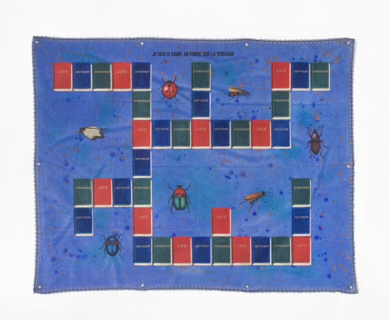 La muestra reúne una serie de telas pintadas con composiciones estructuradas sobre soportes no tradicionales como manteles y lonas, representando iconografías sobre fondos llamativos. A través del reciclaje y de la recolección, utiliza nuevos dispositivos y herramientas para ilustrar el imaginario que rodea su proceso creativo.